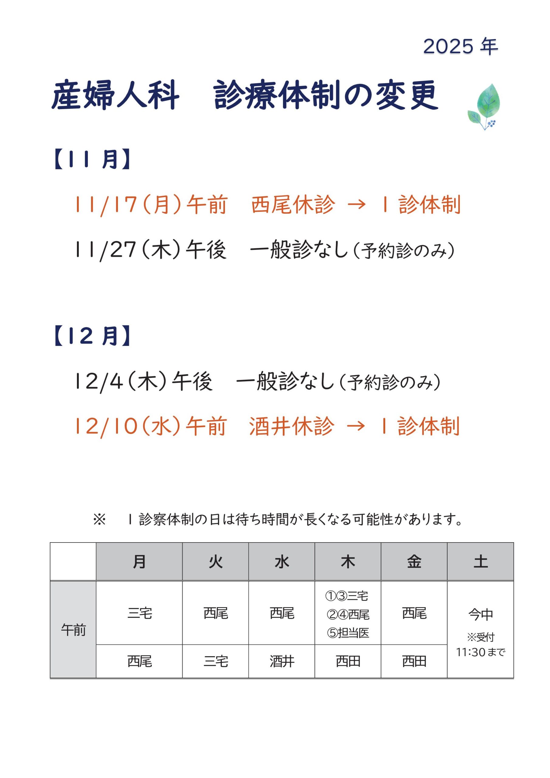 ホーム 新着情報 一覧 11月・12月の産婦人科の休診代診案内