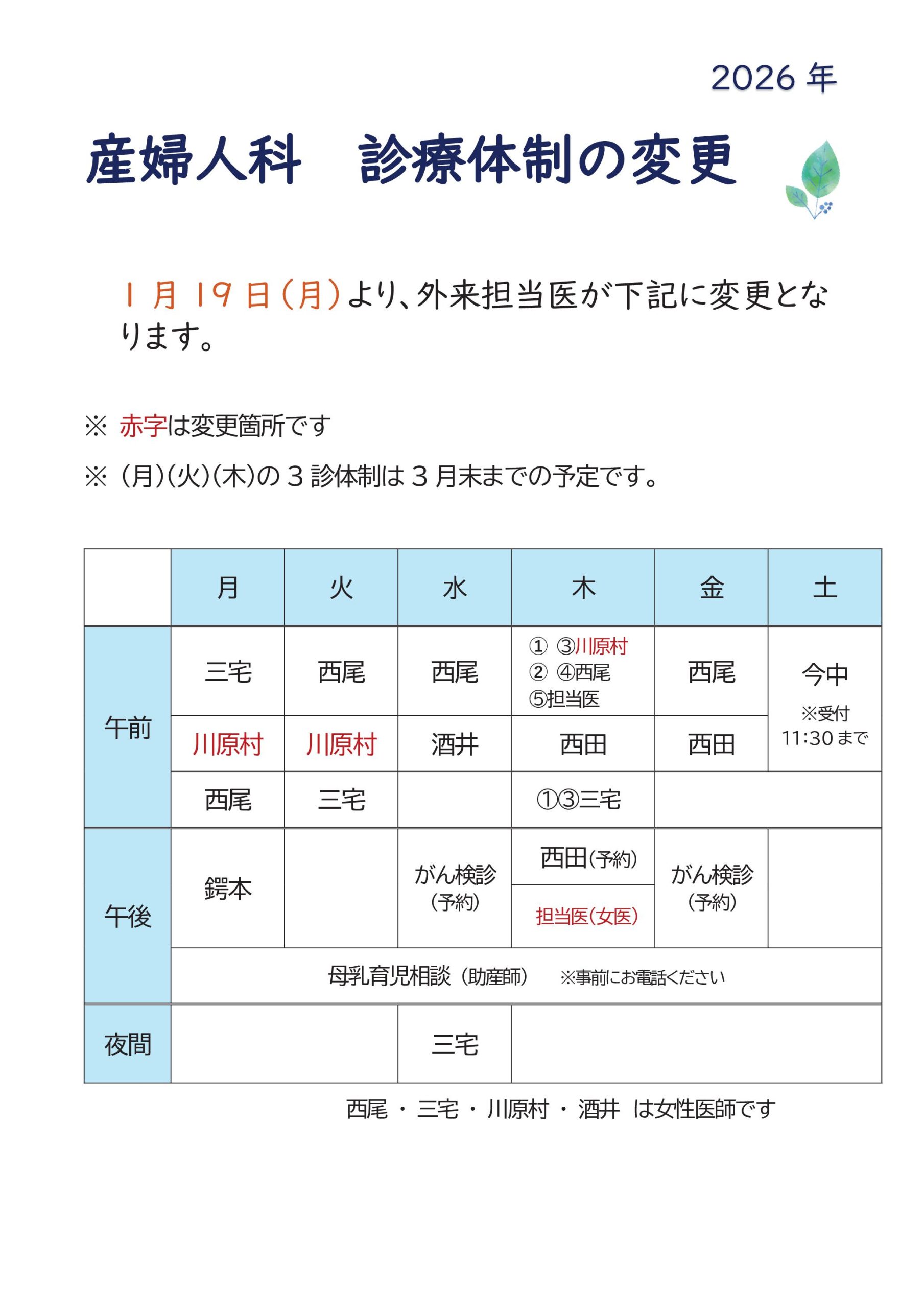 ホーム 新着情報 一覧 診療体制変更(1/19~)
