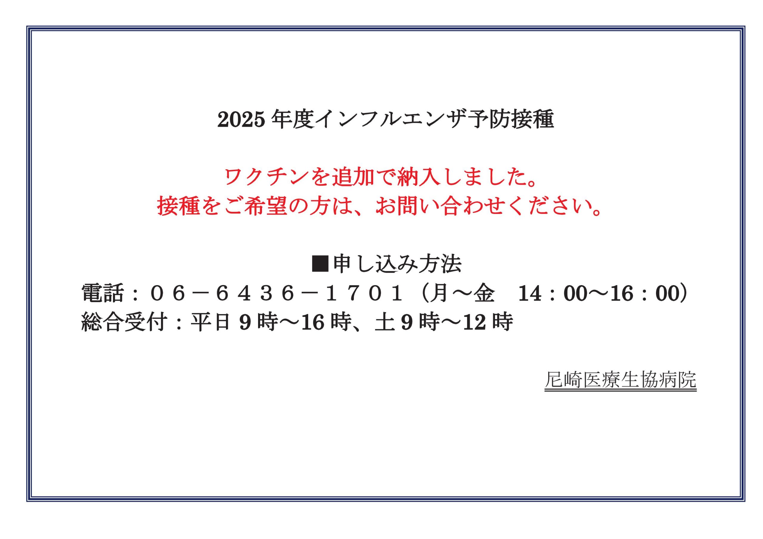 インフルエンザワクチン 一般枠 申し込み再開のお知らせ